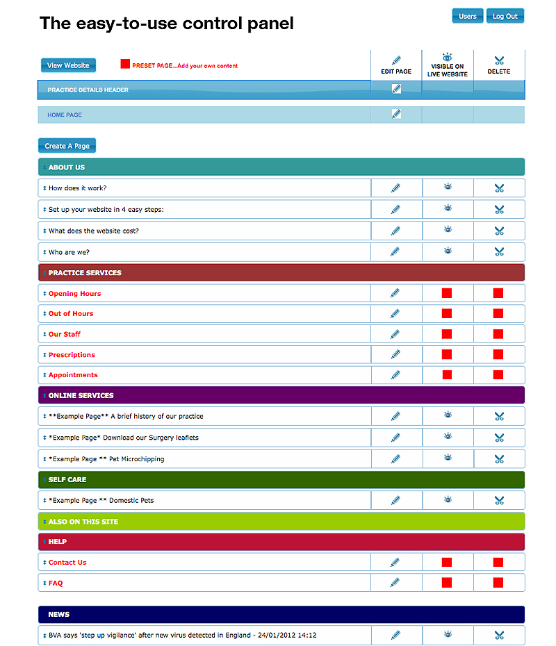 Unlimited pages which YOU create. Change the order, upload documents for your patients to access, information packs, surgery newsletters... whatever you choose, our unique user friendly control panel makes it so easy